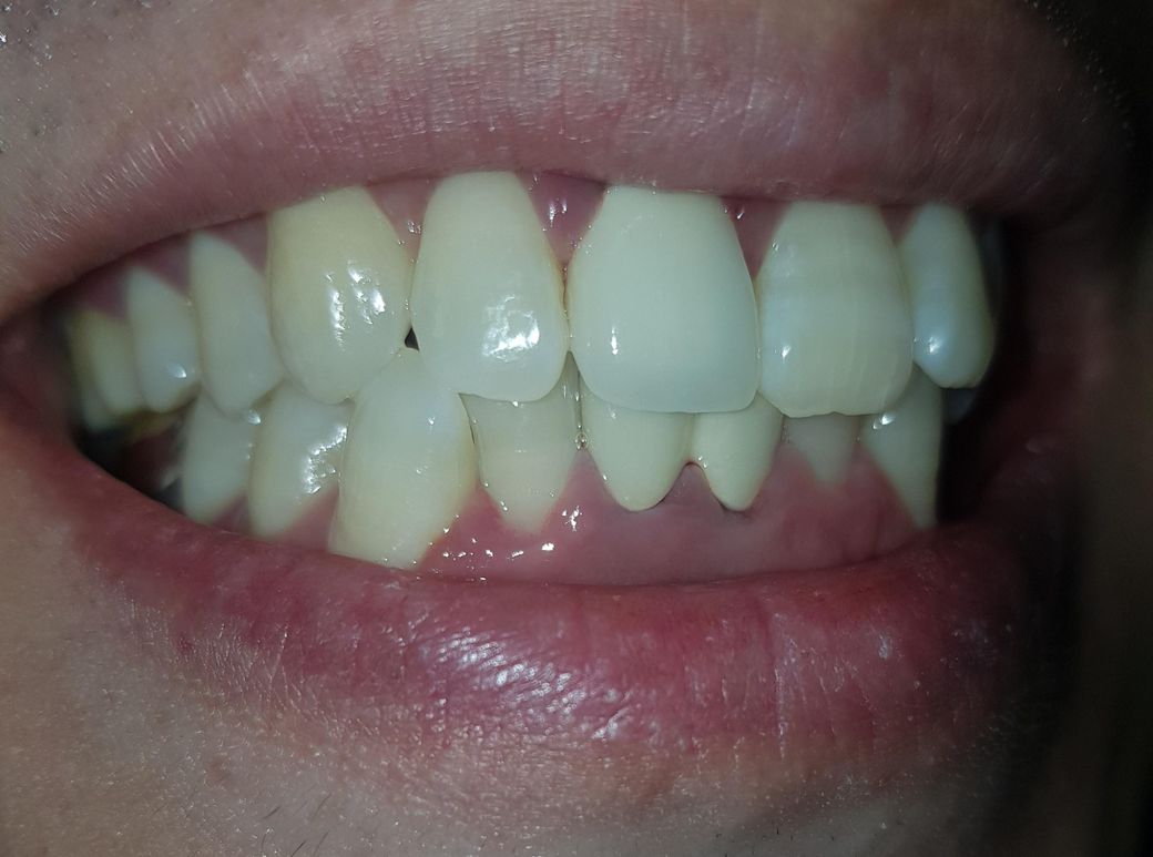 해당 부위가 어둡게 보이는 이유는 보철물 내부의 금속 색깔이 밖으로 비춰 보이기 때문입니다. 내부의 금속색은 검은색을 띄고 있는데 이 검은색의 잇몸이 내려가면서 보일 수 있습니다.