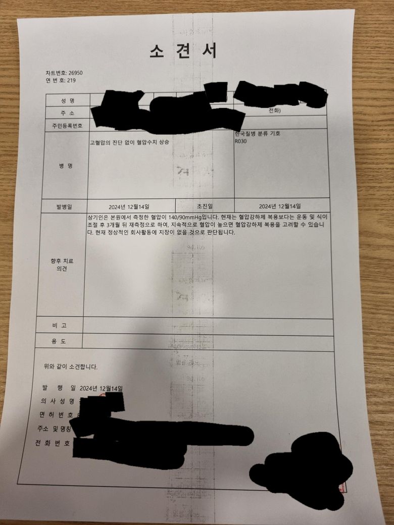 제가 금요일 날 물류센터 면접을 보게 되었는데요. 거기서 통보도 없이 생뚱 맞게 면접자들 혈압을 재길래 다른 분들 하고 저 포함 해서 150?/90?대로 나왔거든요. 아무튼 높게 나왔다고 해서 오늘 의원 가서 쟀는데요 140/80 이렇게 나와서 소견서 까지 해서 혈압을 재고 왔는데요. 그래서 채용담당자 한테 보냈습니다.(의사 소견서 보래라 해서 보냈습니다) 소견서가 이렇게 나왔는데 불합격 주지는 않겠죠?