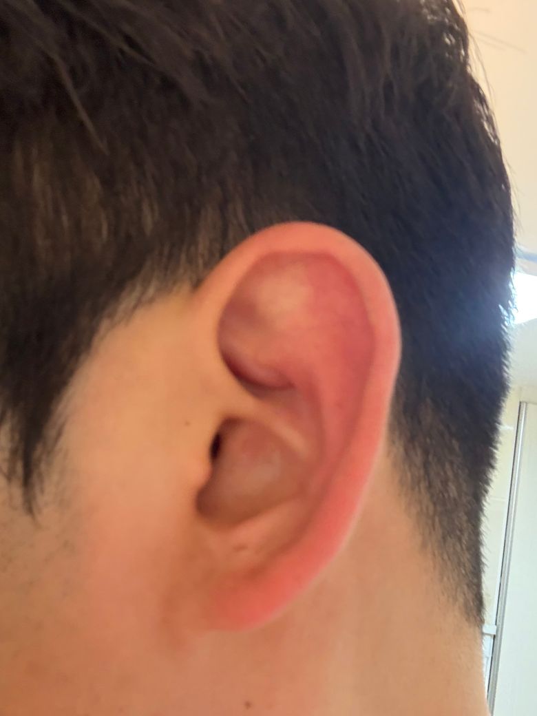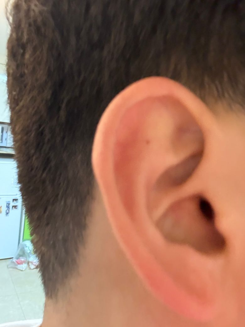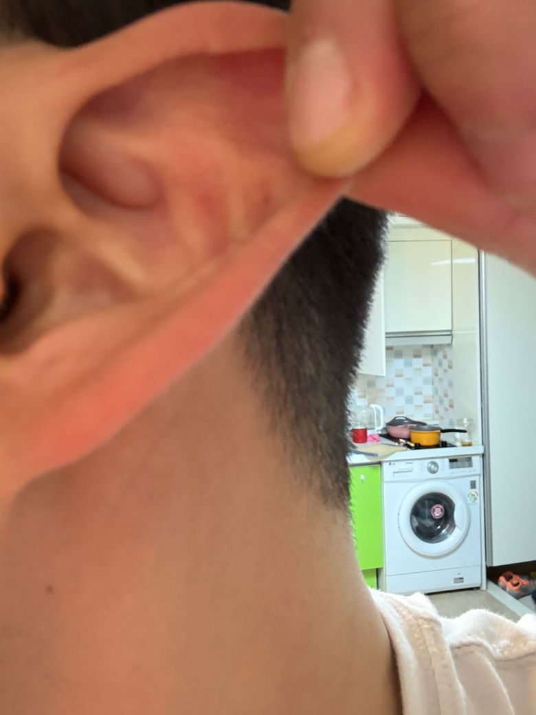 귀 삼각와 주변 고름 찬 거 아닌데 부풀어 올라있는데 뭘까여? 통증은 계속 있고 귀 접을때나 부풀어 오른데 만질때마다 통증이 있습니다. 통증이 있는 귀 사진은 첫번째, 두번째 사진이고 세번째 사진은 반대쪽 귀 사진입니다.