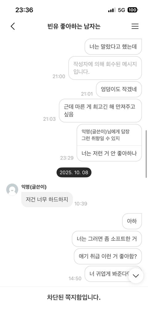 제가 다음과 같이 19금 성적인 대화를 나누었는데, 상대방에게 갑자기 캡쳐를 다 떴으니 준비해놔라는 협박성 말을 받고 결국 차단당하였습니다.