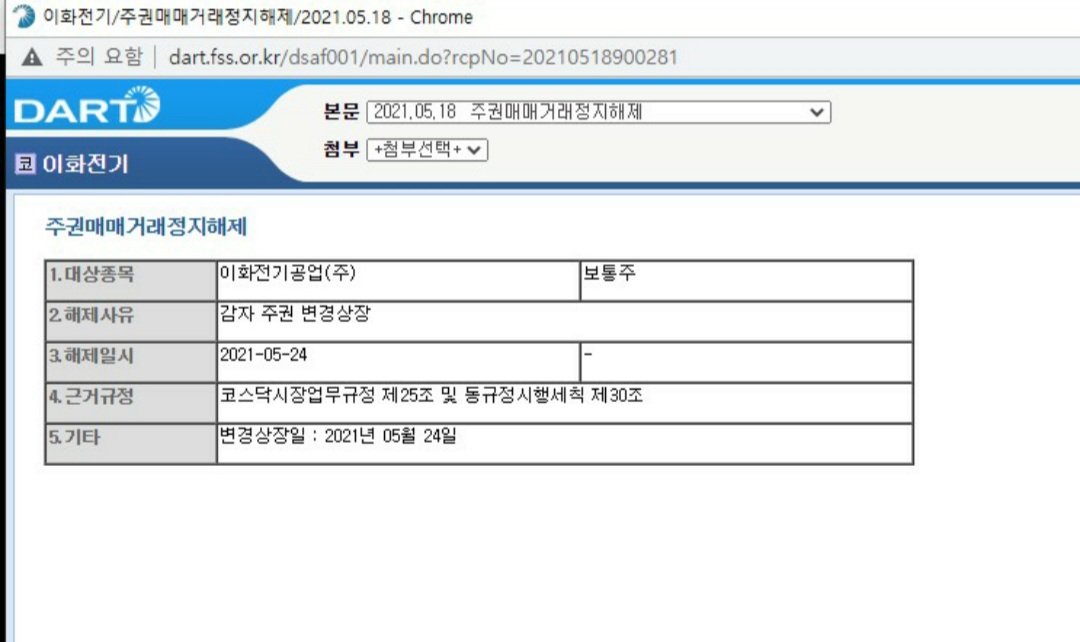 이화전기가 감자하느라 일시적으로 거래정지되었었네요. 감자 적용되어서 5월 24일에 다시 거래 재개된다고 합니다. 거래 재개시 지금 가격(거래정지가)에서 다시 거래 시작합니다.