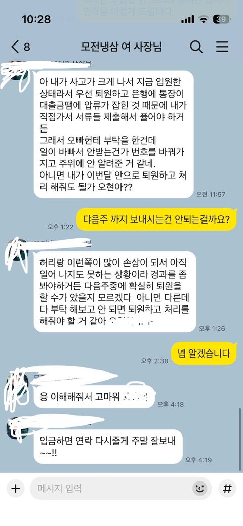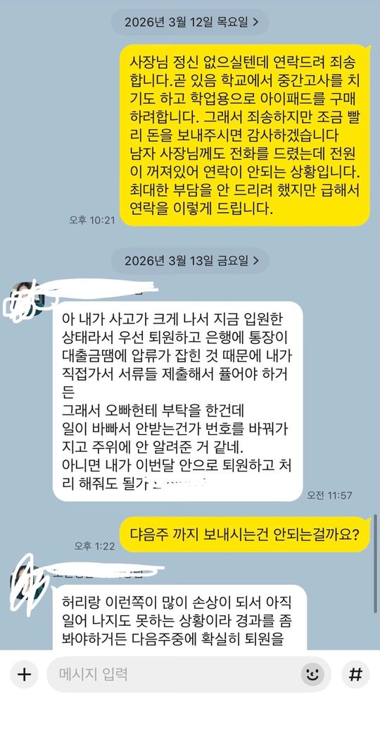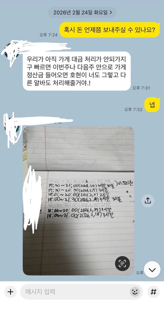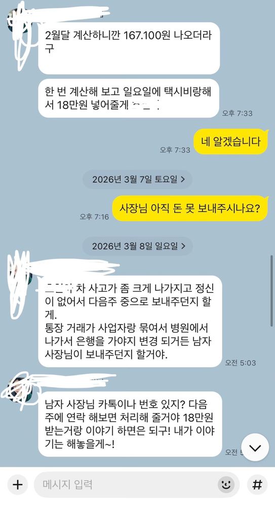 본론부터 말하자면 알바를 했는데 가게가 다른 사람한테 넘기며 가게를 접어서 저에게 돈을 2주안에 보내신다 말하셨습니다 근데 2주가 지나고 사장님께 돈을 언제쯤 보내줄 수 있냐고 물어봤는데 가게 대금처리가 안되서 1주일 이내로 보낸다 했습니다