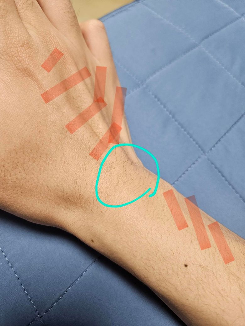 사진은 제가 증상을 느끼는 부위입니다. 철처히 손등쪽이지 손목 통로나 손바닥은 증상이 아예 없습니다