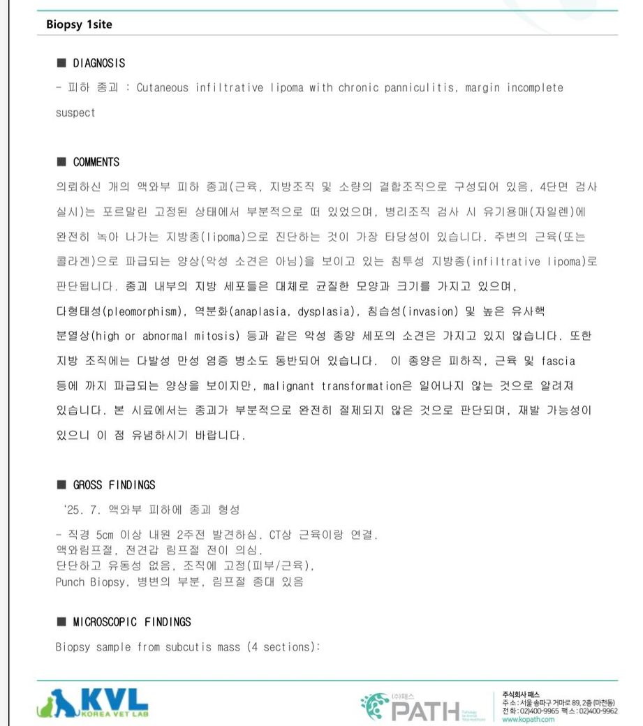 침습성지방종은 그 자체는 양성 종양이나 종양행동학적 성격이 악성종양의 행동패턴을 보이기 때문에 장기적인 관점에서 모니터링이 필요합니다. 주변 연접부에 대한 침습성을 보이지만 원격 전이를 보이지 않는 특징이 있어 다른 종양처럼 전이등에 의한 문제를 크게 걱정할 필요는 없는 종양입니다. 다만 동반된 지방층염이 종양에 의한 국소적인 반응이라면 수술을 한 상태이기 때문에 완치 가능성이 높으나, 면역원성으로 발생한 지방층염이라면 종양보다 지방층염에 의한 질병상태 유지, 악화 가능성이 있으니 이런 부분도 면밀한 추적검사가 필요한 사항입니다.