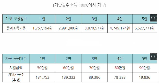 ○ 이번 ‘긴급생계자금’은 기준중위소득 100%이하 가구에 가구원 수에 따라 50만원에서 최대 90만원까지 지원할 계획입니다.