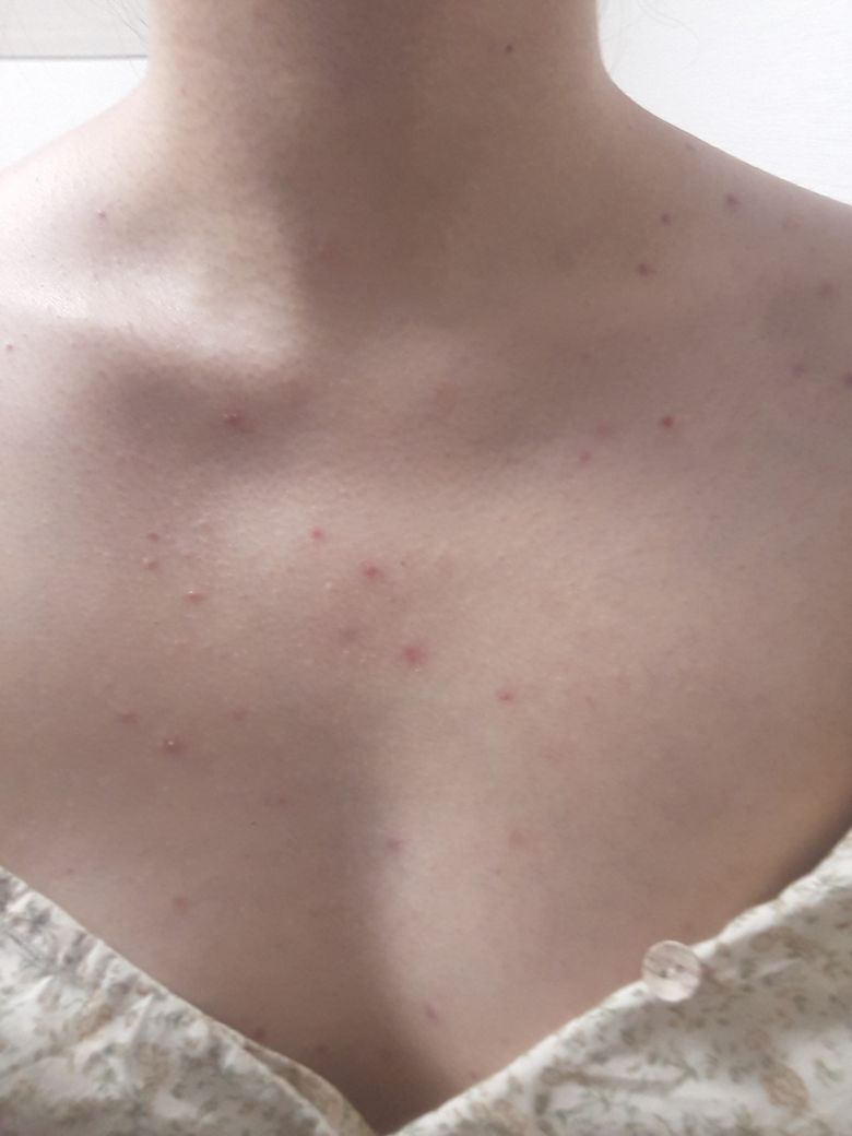 처음에는 한 두개였는데, 하루가 지날 수록 빠르게 퍼지고 있습니다 ㅠ.ㅠ 지금은 가슴에서부터 배꼽 아래까지 퍼져있습니다...