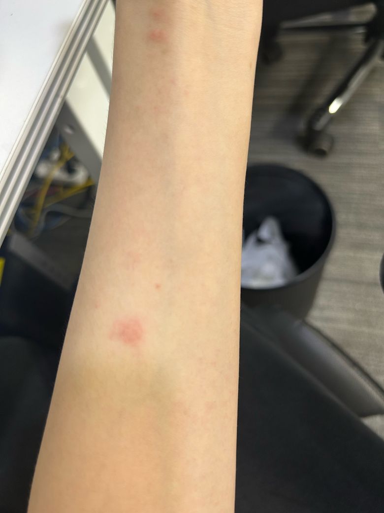 - 오른쪽 팔에만 동그라미 두 개 정도의 연핑크 발진