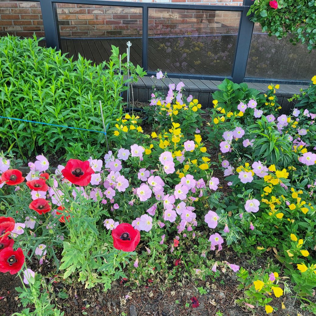 화단의 꽃들을 보니 빨간색은 패랭이 노란색은 황금 낮달맞이 분홍은 분홍 낮달맞이에요 6월에 가장 쉽게 정원에서 키우기 좋을만한 꽃들이네요