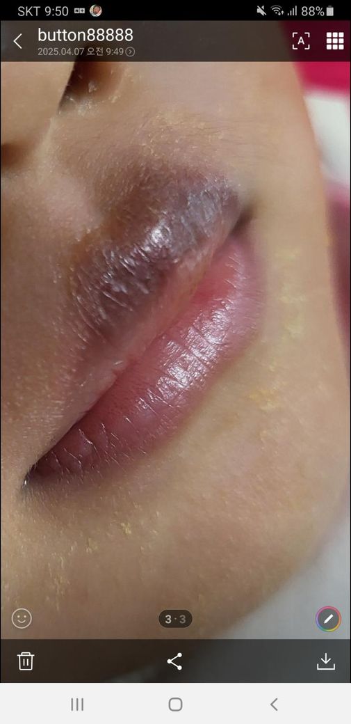 사진으로는 정확한 진단 불가능하며 병원 방문하셔서 직접 육안으로 진료 보셔야 합니다여러 가지 원인이 있을 수 있습니다. 대표적으로는 피부 자극, 알레르기 반응, 습진, 접촉성 피부염, 혹은 색소 침착 등이 원인일 수 있어요. 특히 딱지가 앉는 경우라면, 입술을 자주 핥거나 깨무는 습관, 또는 특정 음식물, 세균, 혹은 기온 변화로 인한 피부 손상일 가능성도 큽니다.