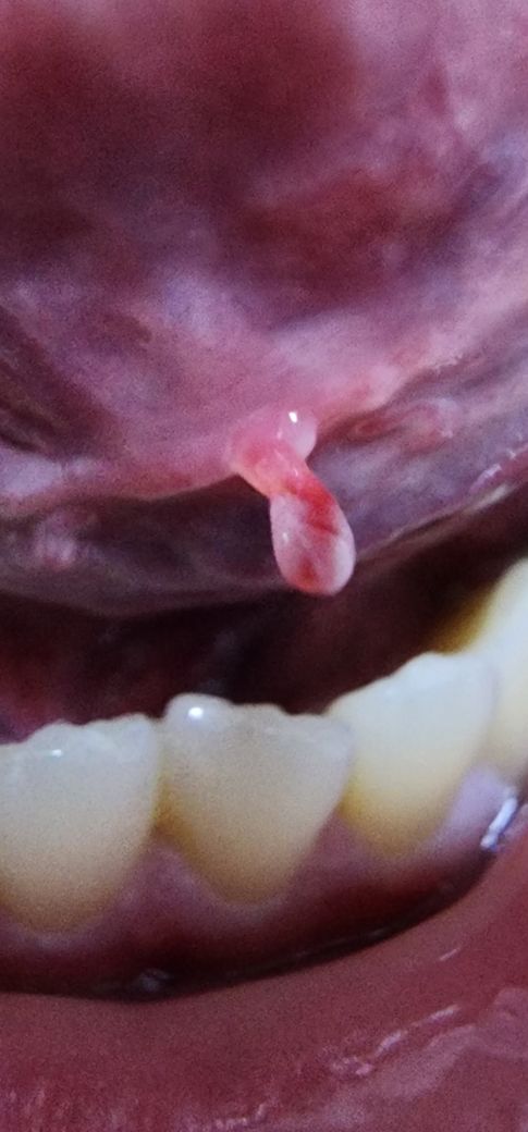 2일전부터 통증이 있어 오늘 확인해보니 이렇게 혀밑에 길게 튀어나와있습니다...