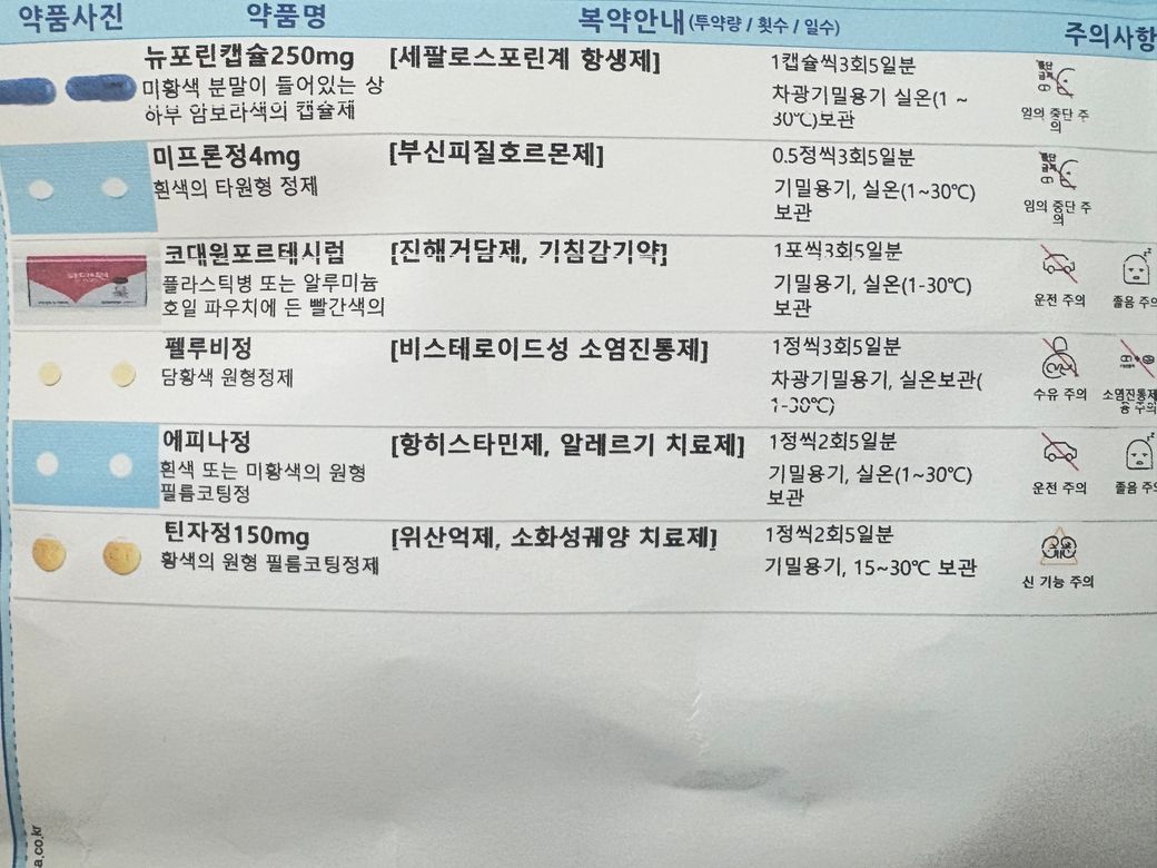 어지러움, 오한, 목감기, 코감기로 사진과 같이 병원 약