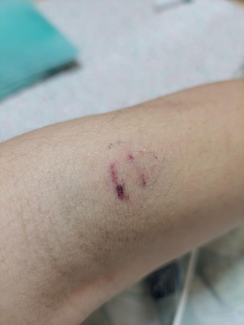1. 수액 주사 부위 주변 실핏줄이 약해져 있는데 혈압 커프 압력이 강하게 눌리면서 모세혈관이 터짐