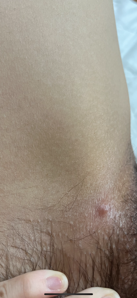 해당 병변은 단순 모낭염이나 국소 염증 정도로 판단되며 성병의 종류로 보이지는 않습니다. 경과관찰 하시면서 크기나 모양변화가 있는지 보시기 바랍니다.