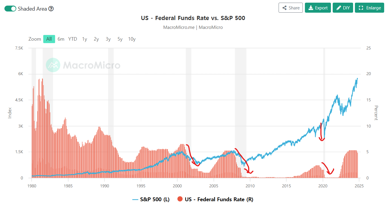 과거에도 금리가 인하될 때 주식 시장이 상승했던 사례가 많긴 했지만 경제 상황에 따라 다르게 나타나기도 합니다.