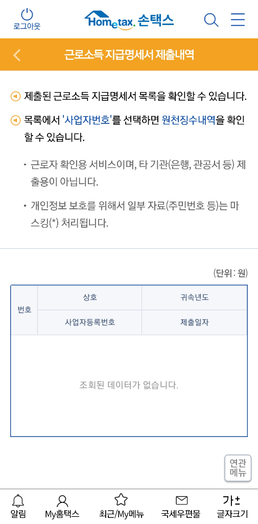 3. 일용근로소득지급명세서는 지금도 조회가 가능합니다. 해당 첨부된 화면은 사업소득도 일용근로소득도 아닌 4대보험도 가입안했다면서 있지도 않은 근로소득지급명세서를 조회하는 화면입니다.