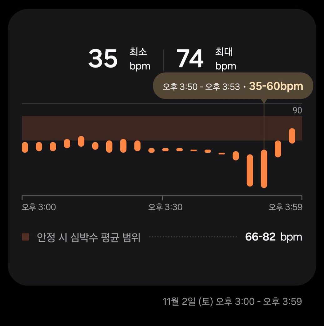 오늘 낮잠잘때 갤럭시워치를 차고 잤는데 최저심박수가 순간적으러 35?가 나와서 좀 놀라서요