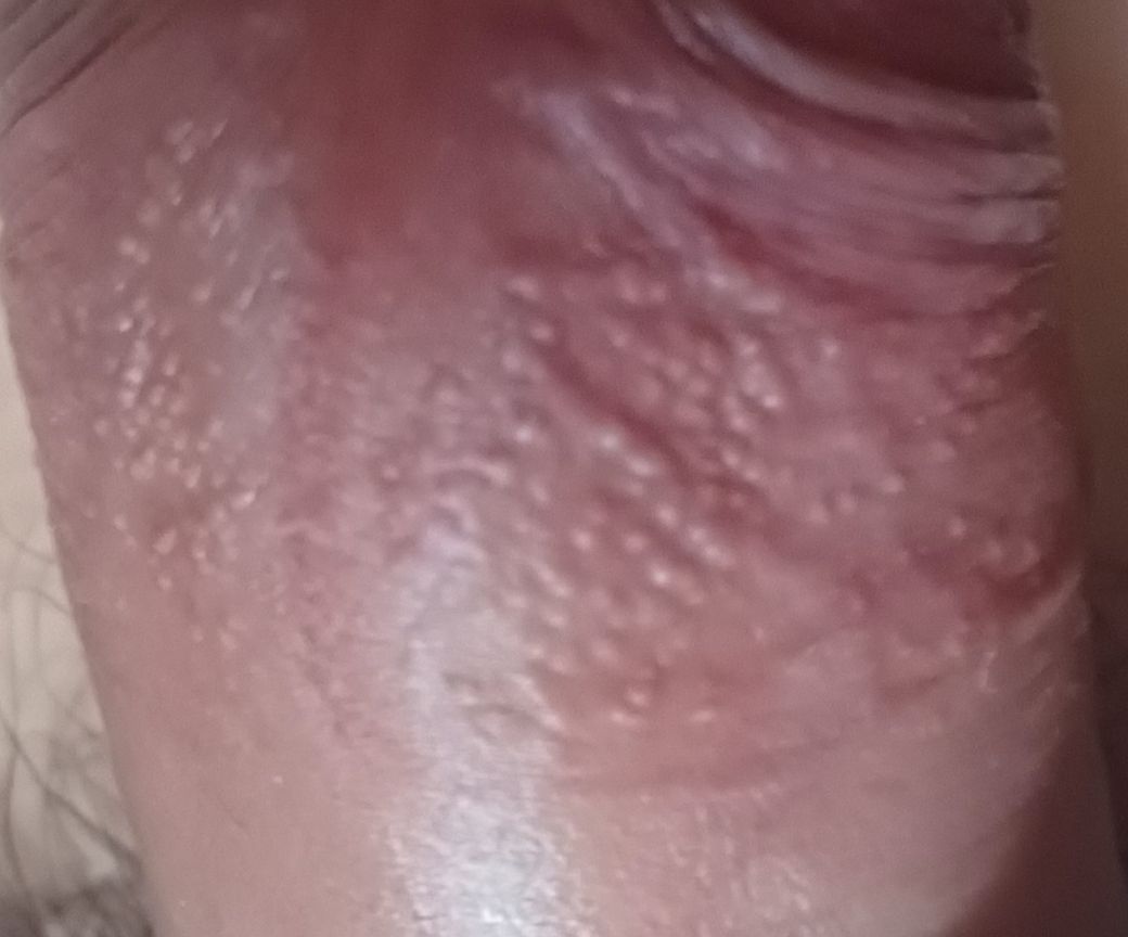 포다이스반이라 보이는데, 이 경우 특별한 문제를 일으키지 않는 병변이라 그냥 두셔도 괜찮고 미용적 목적으로 제거하기도 합니다. 가까운 비뇨의학과를 방문하시면 확인하실 수 있겠습니다.
