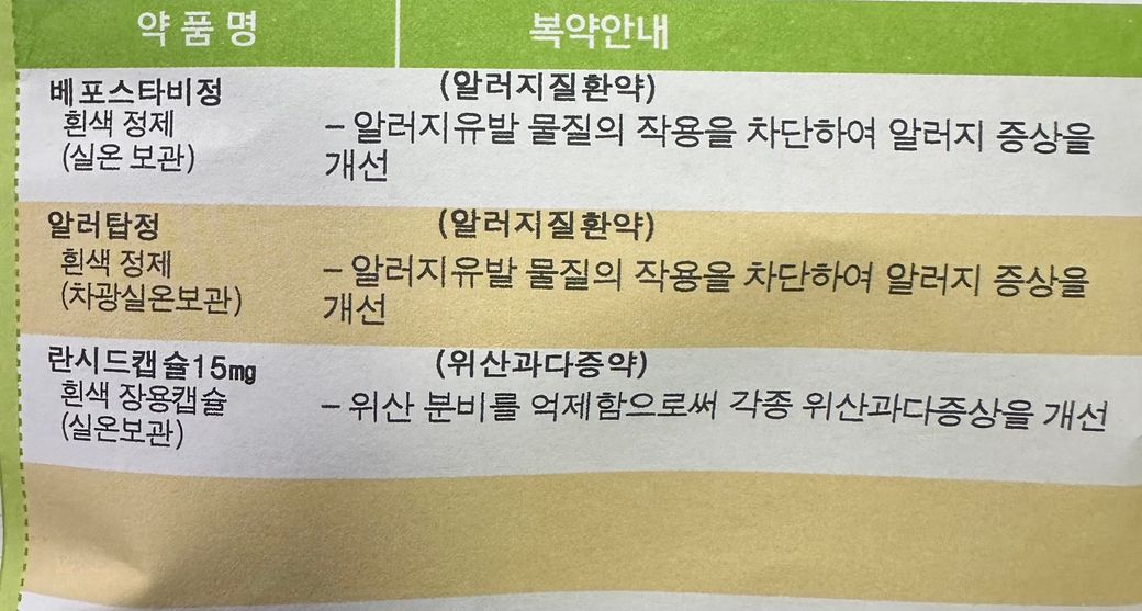 처방받으신 약들 중 베포스타비정과 알러탑정 모두 항히스타민제입니다