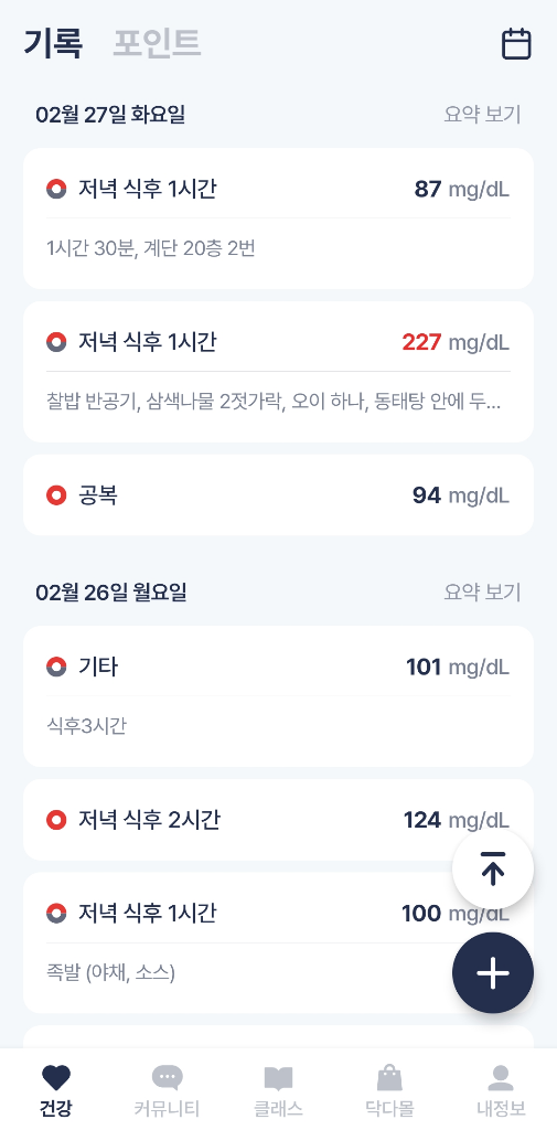 2. 227 숫자를 보고 20층계단 2번 오르고 온건데 겨우 30분만에 저정도로 팍 떨어져도 괜찮은건가요..? 당이 급격하게 오르면 인슐린이 분비가 증가하면서 급격하게 떨어지는 롤러코스터 현상이 일어납니다. 이런 현상이 자주 생기는 것은 바람직하지 않습니다