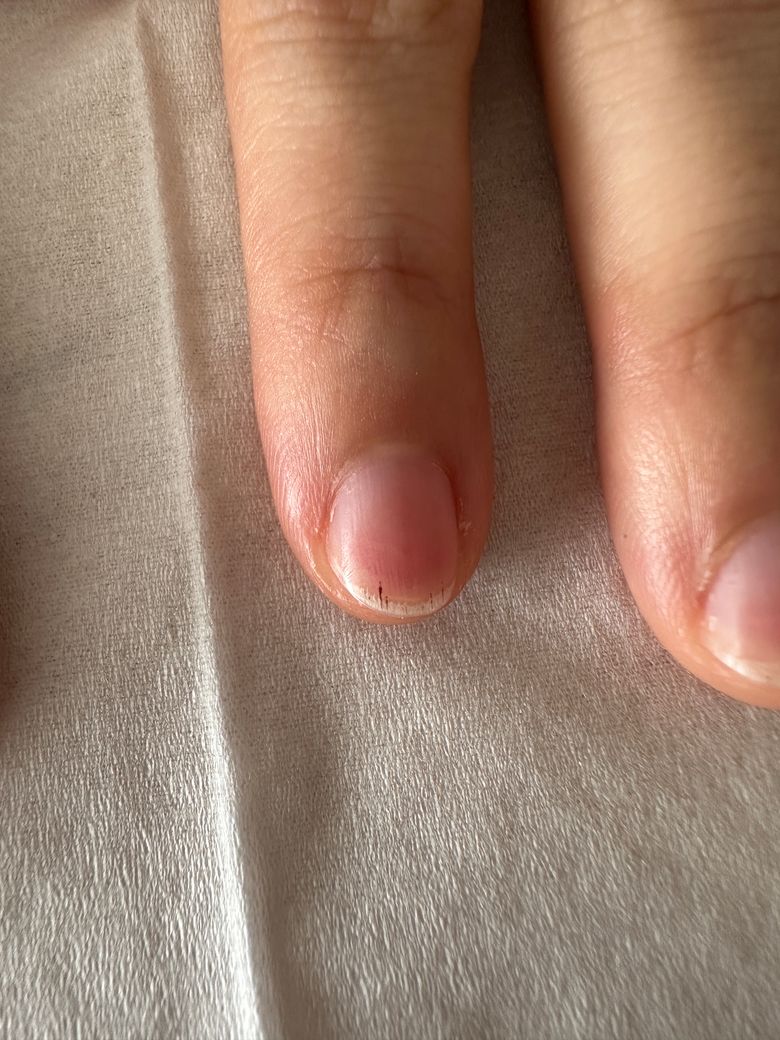 2주전부터 사진과 같이 손톱 중간에서부터 짧게 짧게 듬성듬성 갈색비슷한 세로 줄이 생겼어요.