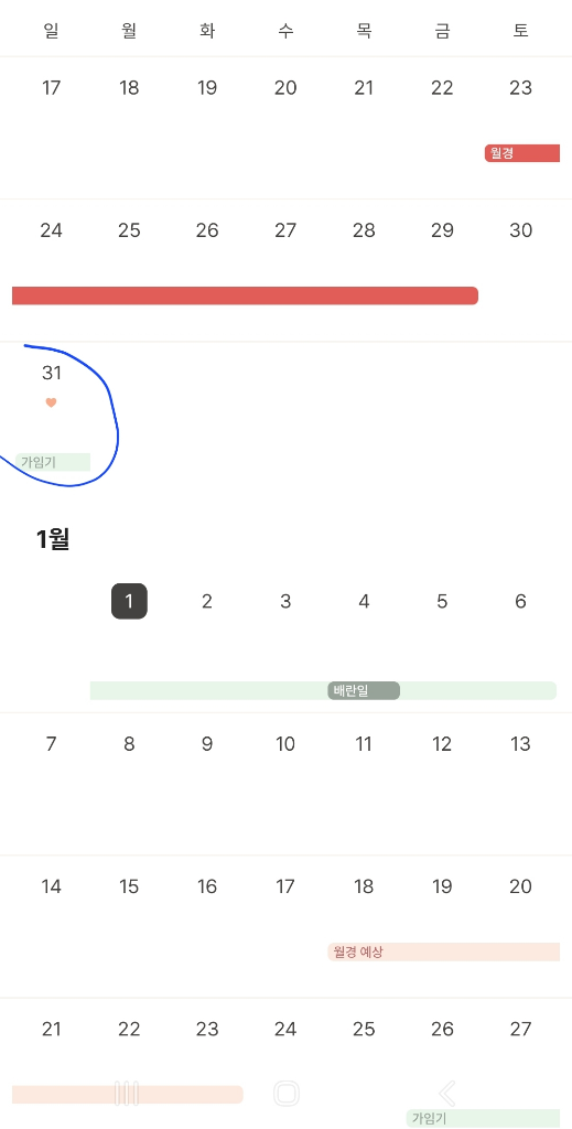 생리가 12/23(토)에 시작해서 12/29(금)에 끝났습니다