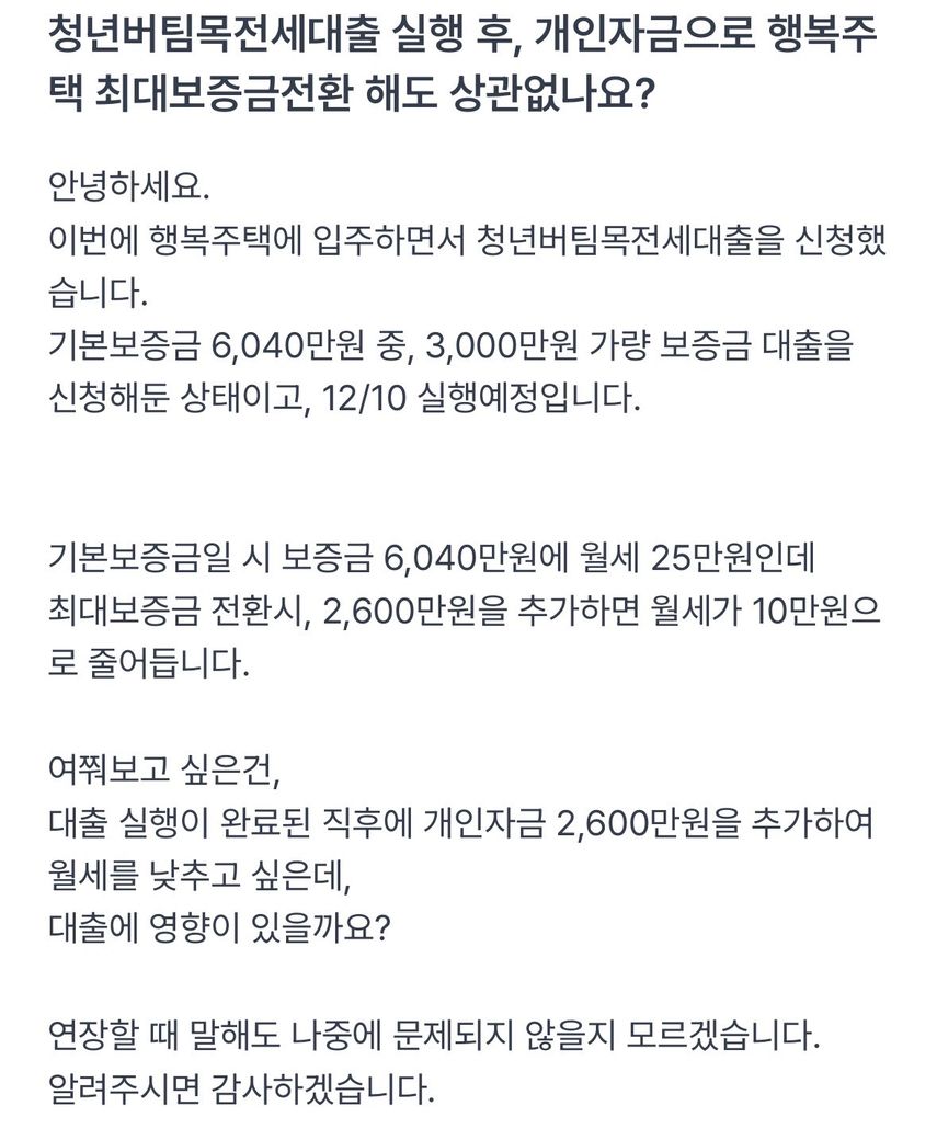 대출을 받고 난후 보증금을 추가 납부하는 것은 대출과 상관이 없어 임대주체와 대출실행후 추가 협의하여 계약변경후 본인 자금을 더 넣으시면 됩니다.