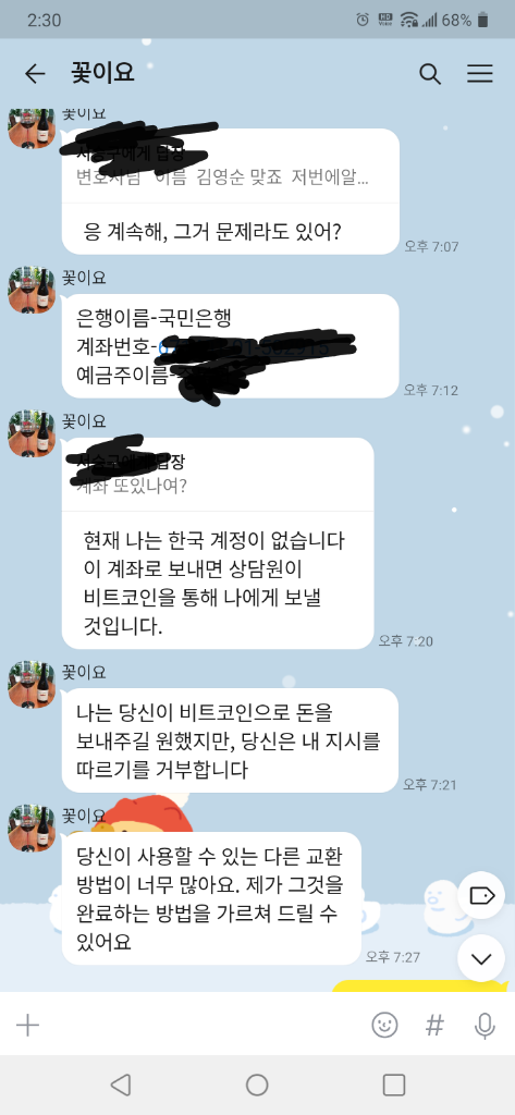 보이스피싱 계좌에 연류가되서 보의스피싱 피의자랑 대화하면서 계죄번호를 피의자가 본인한터알려죠내여