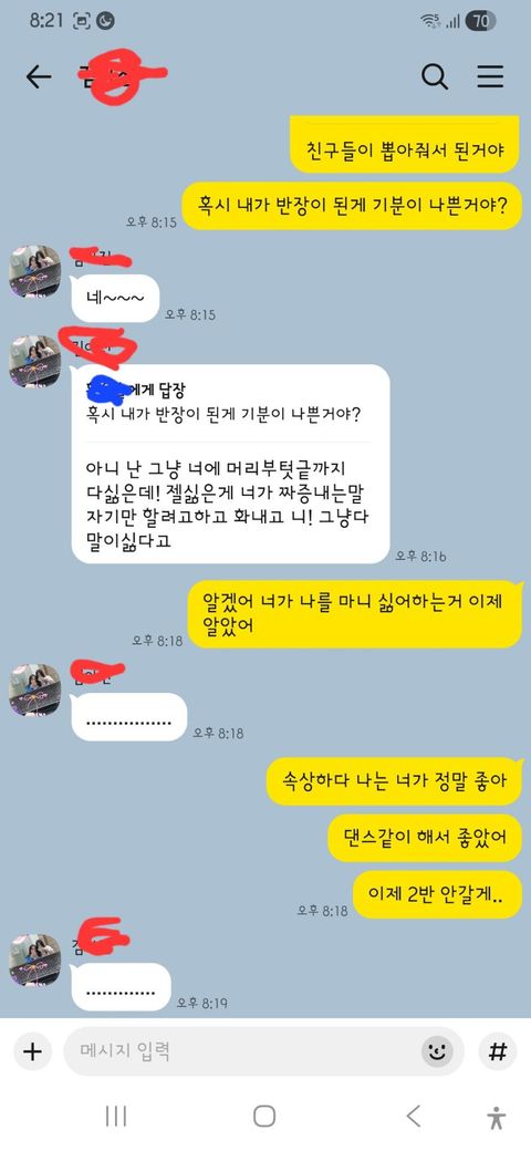 (아이가 직접 톡으로 사실확인했습니다. 다들 그런말 한적 없다며 블루가 좋다는 답변이 옴)
