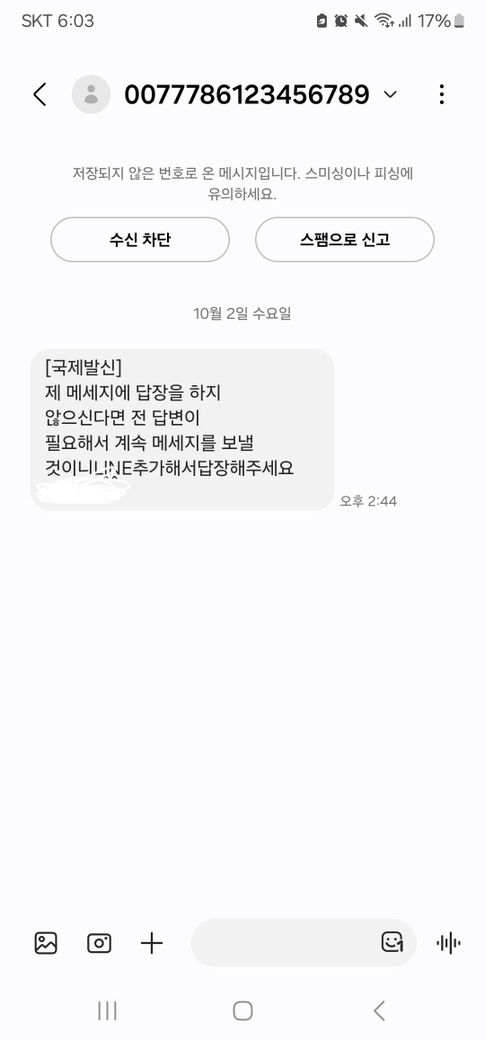갑자기 이런 문자를 받아서 너무 당황스럽네요 이런 문자 받으면 당연히 차단하는게 맞겠죠??? 너무 당황스러워서 질문해봅니다..