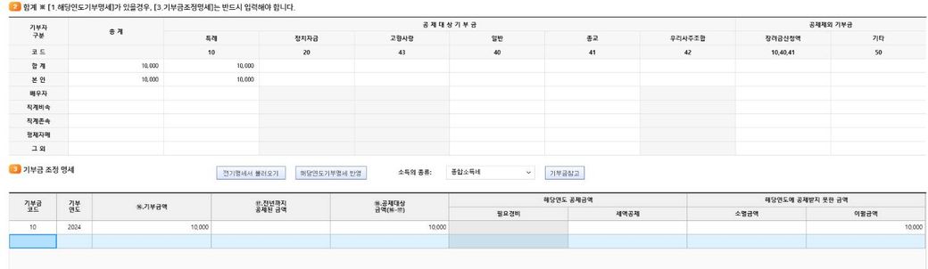 종합소득세신고서 작성하고 근로소득원천징수영수증보면서 반영했는데요.. 기부금1만원을 세액공제 하지않고 아래 사진처럼 반영했습니다.