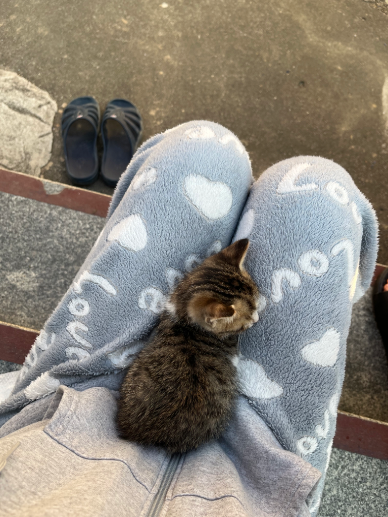 길고양이인데 사람들이 새끼고양이를 이쁘다고 만져서 어미가 고양이 한 마리를 두고 가버렸는데 저녁엔 추울까봐 종이 박스에 담요랑 물 두고 거기서 생활 하고 있구요 한 번씩 나와서 놀아주는데 이젠 물도 안 먹어요 ㅠㅠ 새끼 고양이인데 어떤 음식을 줘야하는지를 잘 모르겠어서 못 주고 있는 상황입니다 저정도 크기의 아기