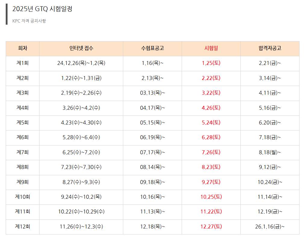 지티큐(GTQ) 시험은 매달 정기적으로 시행됩니다. 2025년에는 매월 정기시험이 있으며, 특별시험도 추가로 진행됩니다.