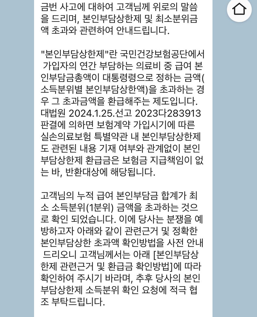 본인부담상한제는 건강보험에서 정해진 한도를 초과한 의료비를 환급해주는 제도입니다. 실손보험에서 이 초과금액에 대해서는 보상하지 않기 때문에, 보험사는 본인부담상한제 적용 여부를 확인하려고 건강보험료 납부내역을 요청하는 것입니다. 이 정보를 제출하면 보험사가 정확한 보상 여부를 판단할 수 있습니다.감사합니다.