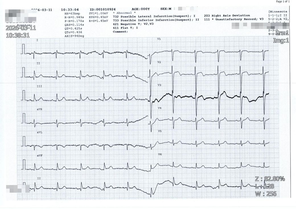 피검사 결과는 약관이랑 확실하게 부합하는거 같아서, 첨부하는 사진의 '심전도검사'가 "전형적인 심전도 변화(ST분절, T파, Q파 중 새롭게 출현)" 조건을 충족할 수 있는지 묻고 싶습니다.