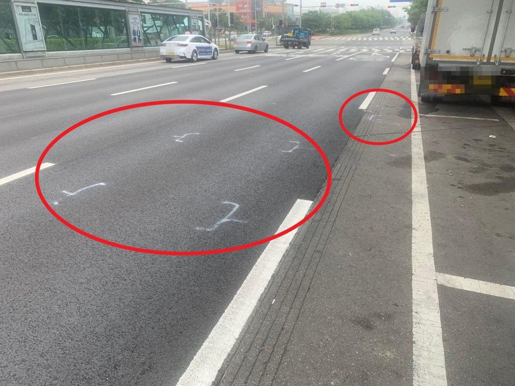 2. 대로에서 우회전 하려면 5차선으로 가야하는데 당시 거리에서 32~40미터(점선 4~5개) 앞까지만 점선이였고 그 이상은 실선으로 되어있어 아버지는 차선을 변경 할 수 밖에 없었습니다.