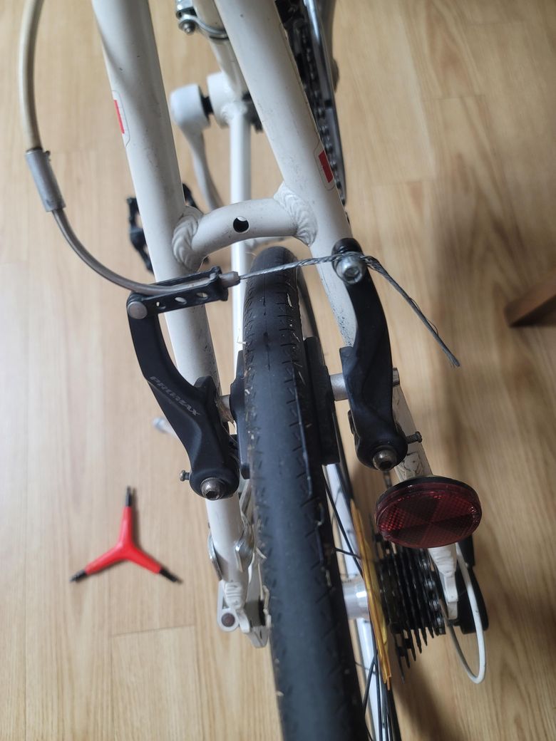 브레이크 암 조정 : 브레이크 암의 고정 나사를 풀고, 브레이크 암을 위아래로 이동시켜 휠에서 떨어진 거리를 조정합니다. 원하는 거리로 설정한후 나사를 다시 조여 고정합니다.