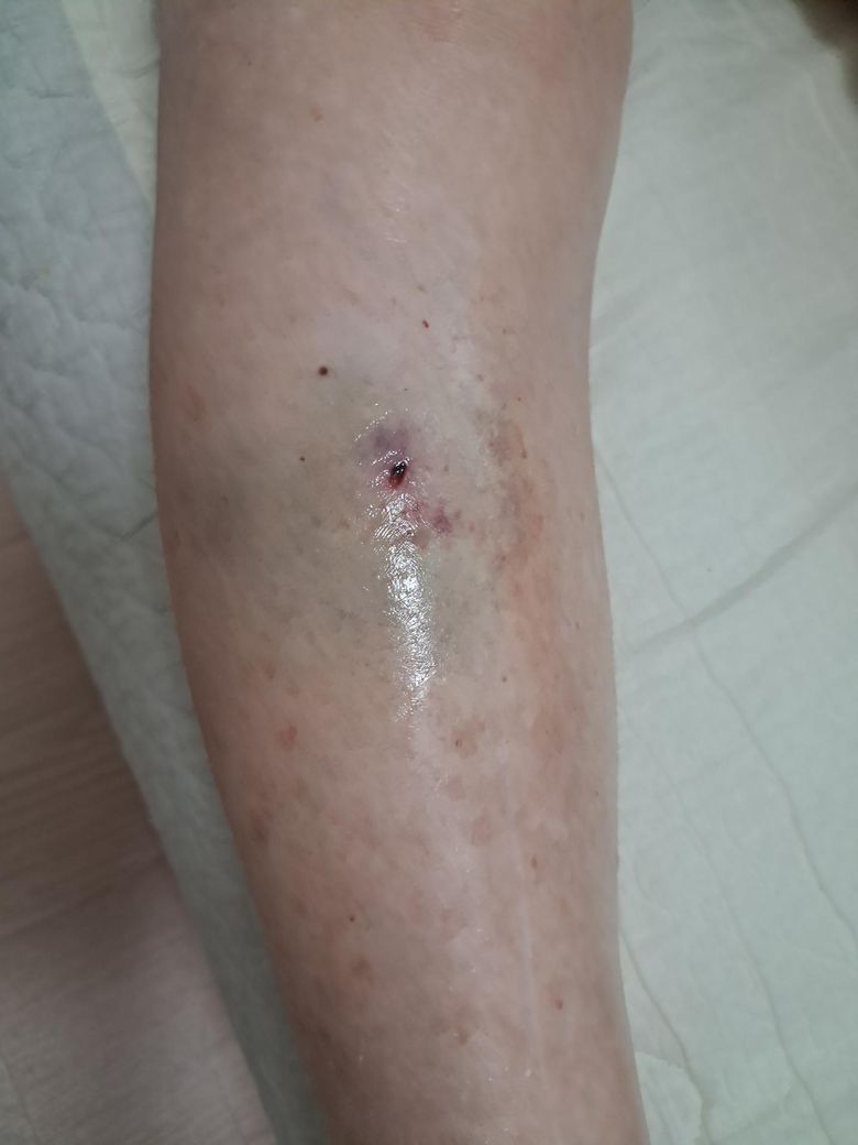 어머니께서 5일전에 다리를 부딪혀서 피부가 벗겨지고 조금 파여서 박테로신연고를 계속 발라드렸습니다