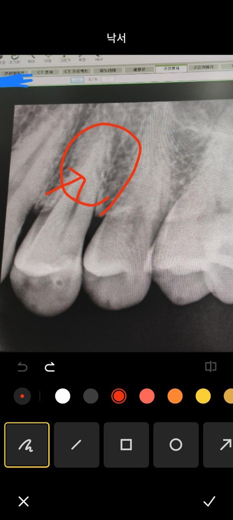 엑스레이 사진상 동그라미친 부분 사선으로 미세하게 뿌리까지