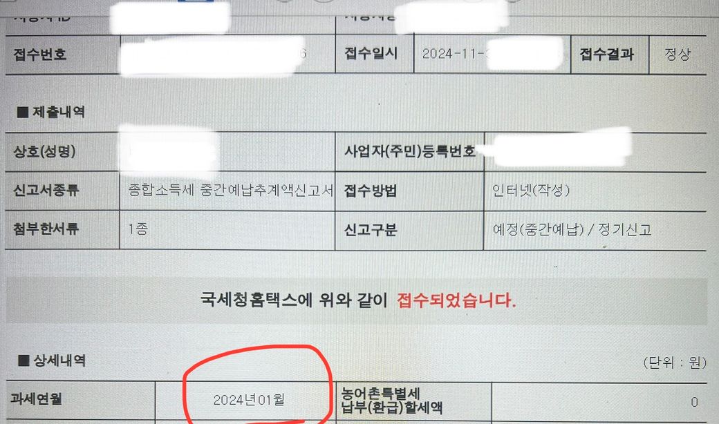 안녕하세요 종소게 중간예납추계액신고서 작섣하얐는데 사진에서와 같이 상세내역에 과세연월이 2024년1월로 표기되는데.. 자동으로 설정이 된것같은데