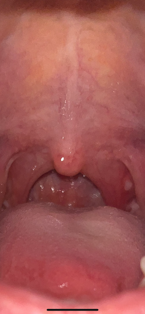 양 쪽의 편도가 일부 사진에 담겼지만 조금 담긴 편도에도 염증이 보입니다. 편도염을 의심해야 하겠으니 이비인후과나 내과를 방문하시기 바랍니다.