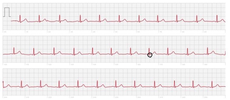 스마트워치의 심전도 결과에 대해 걱정스러우시군요. 동그라미 치신 부분은 QRS 파의 일부분인데, 이 사진으로는 어떠한 정보도 얻을 수 없습니다. 맥박은 규칙적이고 파형은 일정하며 특별히 문제삼을만한 부분은 없는 심전도입니다. 다만 스마트워치는 전극이 하나뿐이라서 정확한 정보를 얻긴 어렵습니다. 걱정되시면 병원을 다시 방문하시기 바랍니다.