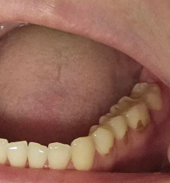 사진으로 정확하게 보이진 않지만 충치 가능성이 있습니다. 충치라면 충치를 제거하고 치코용 재료를 충전을 해줘야 할 수 있습니다.