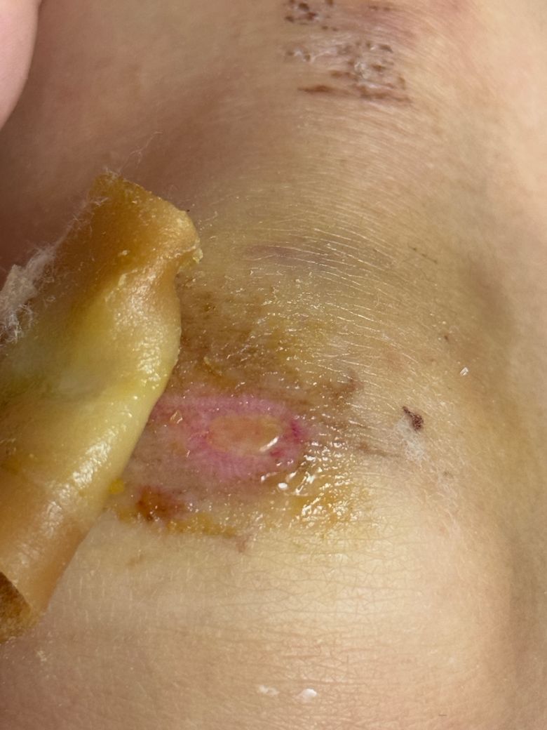 올려주신 사진으로 미루어 상처는 잘 회복되고 있으므로 지금과 같이 상처 소독과 습윤 드레싱을 좀 더 유지하기 바랍니다.