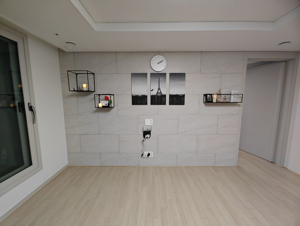 선반을 설치한 후의 거실 모습을 보니 선반이 포스트와 아트월과 잘 어우러지지 않는다는 느낌을 받으셨군요. 거실의 느낌과 선반의 스타일이 조화롭게 어울리지 않을 때는 몇 가지 방법을 고려해볼 수 있습니다.
