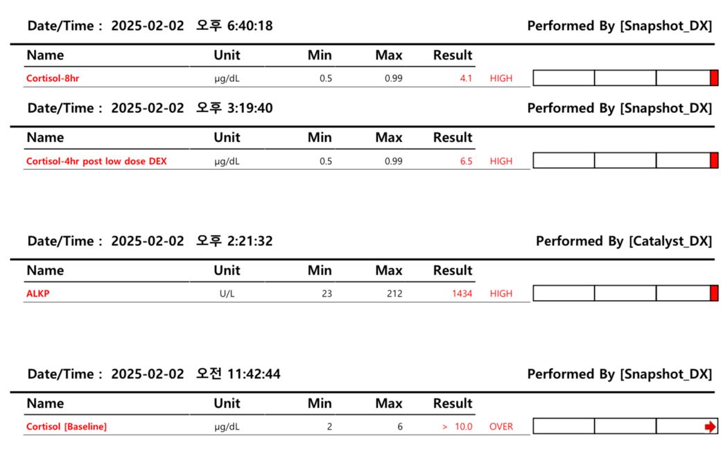 혈검지 수치를 보면 쿠싱 같긴합니다. alkp 수치가 높고 지방간에 고 콜레스테롤에 RBC HCT도 높게 나오고ㅠㅠ 근데 전해질 수치는 전부 정상이구요..;;
