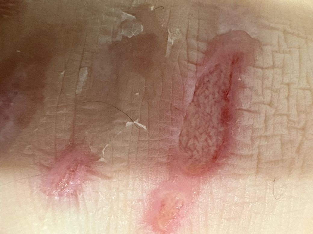 처음에는 해당 부위가 가려워서 긁다가 상처가 생겼고, 이후에도 계속 긁으면서 상처가 더 악화되었습니다. 처음에는 작은 부위였는데 점점 옆으로 번지면서 현재와 같은 상태가 되었습니다.