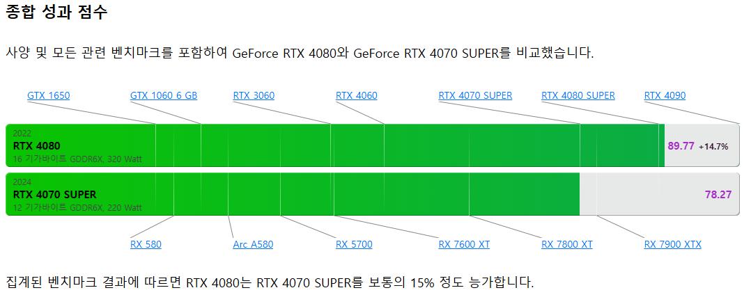 RTX 4080은 RTX 4070 Ti Super보다 약 15~20% 더 높은 성능을 제공합니다. 고해상도 게임과 3D 작업에서 RTX 4080이 더 안정적이며, 특히 4K 해상도에서 큰 차이를 보입니다. 예산이 허용된다면 RTX 4080이 장기적으로 더 적합합니다