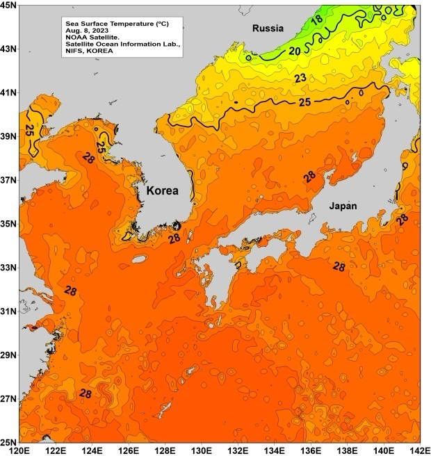 그래도 어거지로 해석한다면 8월의 황해 수온은 일반적으로 많은 강수량으로 인해 해안선 부근이 중앙부보다 낮습니다. 그러나 사진상에서는 중앙부나 해안선 부근이나 수온 차이가 크지 않은 것으로 보입니다. 강수량이 적었거나 해수 수온 상승의 영향 또는 지구 온난화로 인해 황해난류가 예년보다 강해져 황해 전체의 수온을 끌어 올린 것으로 보입니다.
