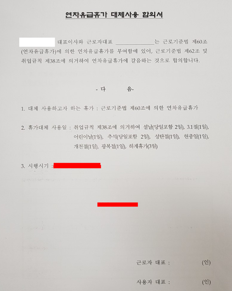 해당 연차휴가대체 합의서는 근로자 개인과 합의하는 것이 아니라, 근로자대표와 사용자가 합의하는 것입니다.
