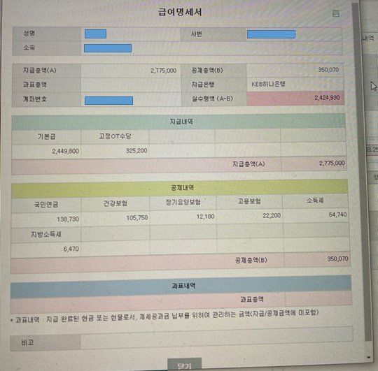 - 배우자 명세서 상 고정ot수당은 매일 1시간 초과근무 한다고 가정하고 수당을 지급한다고 하네요...